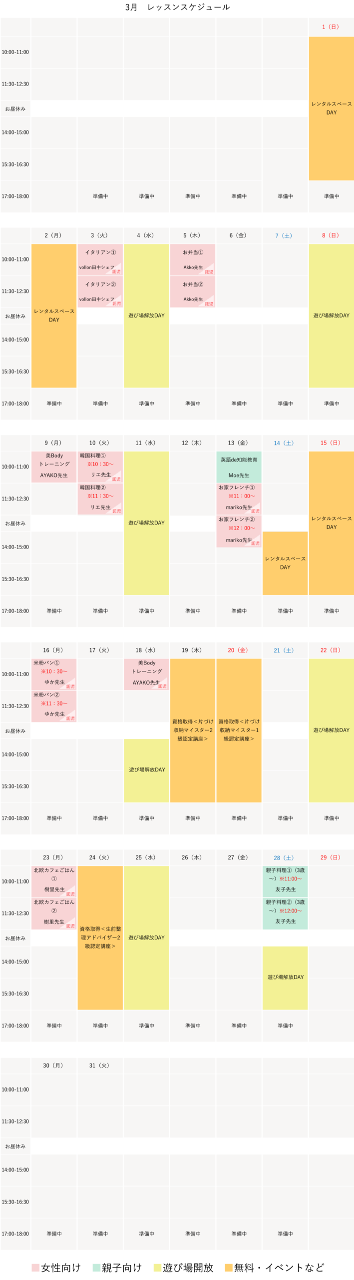 3月のレッスンスケジュール